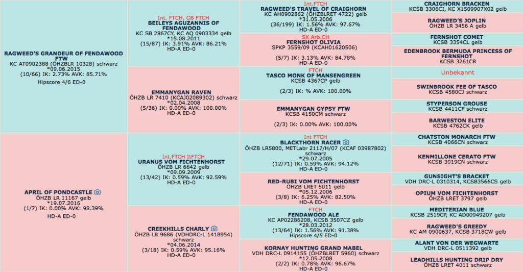 | Gesundheit: | HD A, ED 0/0, OD frei, prcd-PRA N/N, CNM N/N, HNPK N/N, EIC N/N, SD2 N/N, NARC N/N, Augen frei | Gesundheit: | Hips 4/6, ED 0/0, AU-frei, prcd-PRA N/N, CNM N/N, EIC N/N, SD2 N/N |